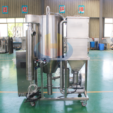 產品展示小型噴霧干燥機主要在科研階段對溶液或流體樣品進行噴霧干燥成粉或微小顆粒。其原理是通過霧化器將樣品霧化成微細霧滴,進入干燥室內進行熱交換,水份瞬間蒸發,固體經過旋風分離器進行回收,飽和氣體經過除塵器過濾后排空,本設備可應用于從試驗室到一般研究室的噴霧干燥作業,在食品醫藥化工行業均可良好的應用。
